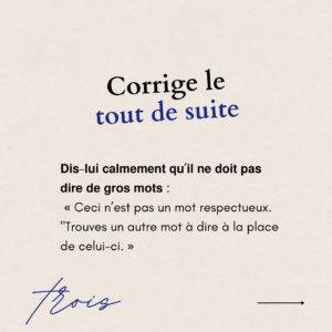 Ensuite, il est utile d’expliquer calmement à l’enfant que l’utilisation de gros mots n’est pas appropriée et qu’il y a des conséquences négatives. Les parents peuvent également fournir des alternatives pour exprimer leur frustration ou leur colère, comme prendre une pause ou parler calmement de ce qui ne va pas.