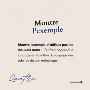 Enfin, l’exemple parental est essentiel pour encourager un langage positif. Les enfants imitent souvent le comportement des adultes, donc les parents doivent être attentifs à leur propre langage et modéliser des comportements appropriés. Les parents peuvent aussi renforcer les comportements positifs en reconnaissant et en récompensant l’utilisation d’un langage respectueux.